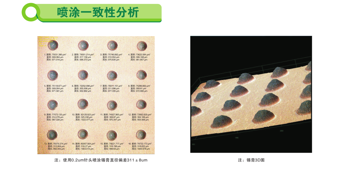 本产品应用在喷涂工艺,具有喷涂工艺窗口宽,出锡量均匀焊点一致性好,锡膏不坍塌成型好等特点。膏体性质稳定,满足长时间喷涂要求,可多次冷藏回温使用。